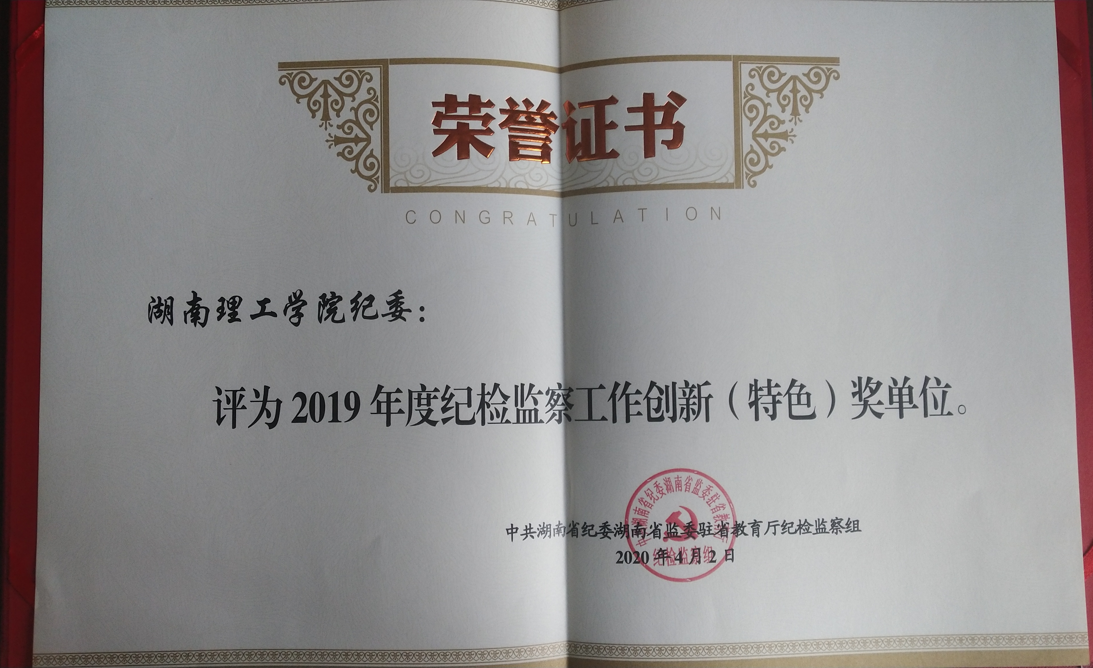 近日,省纪委省监委驻省教育厅纪检监察组发文,学校纪委获评全省高校2019年度纪检监察工作先进单位和纪检监察工作创新(特色)奖单位。